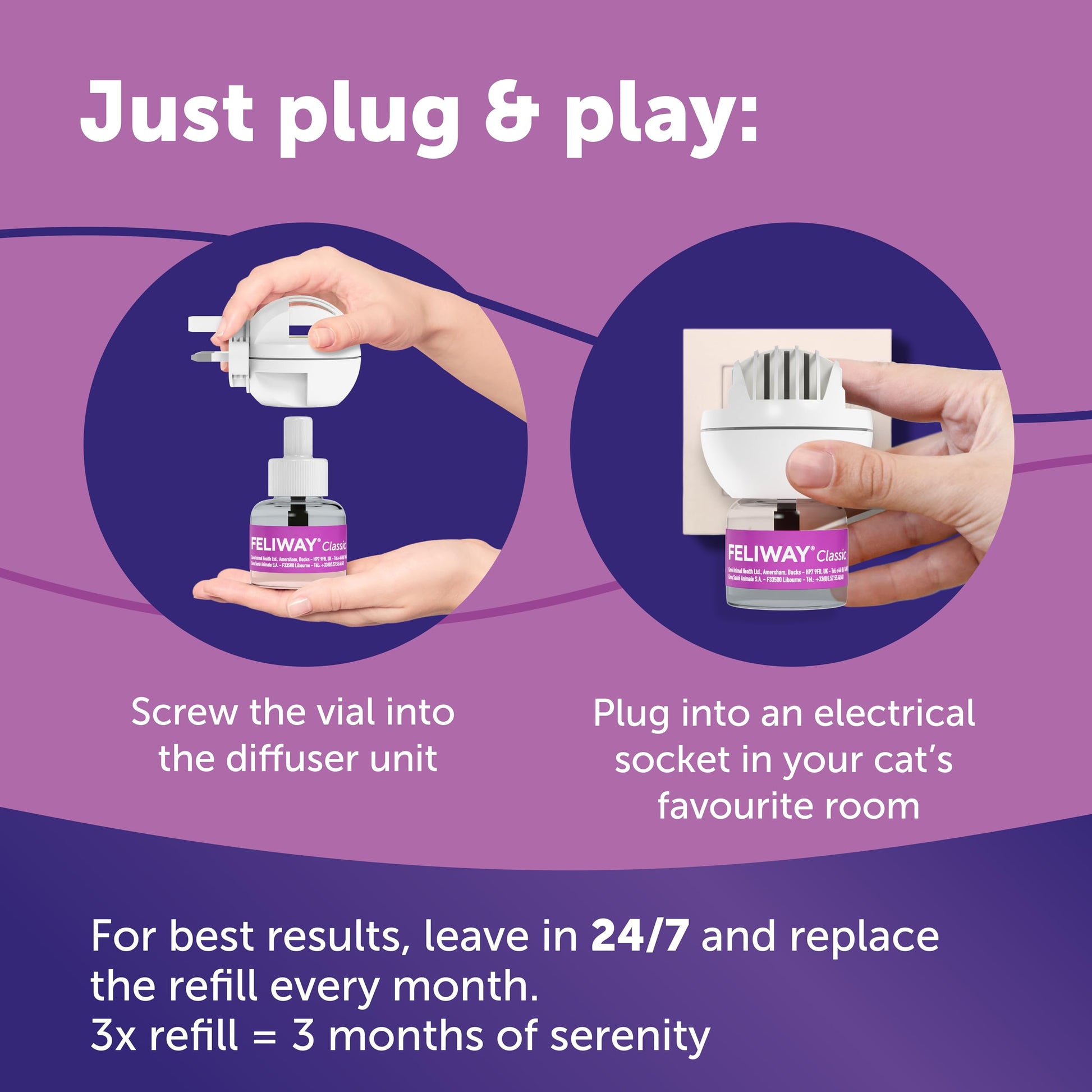 Insert a 48ml refill into your FELIWAY diffuser unit according to diffuser instructions.